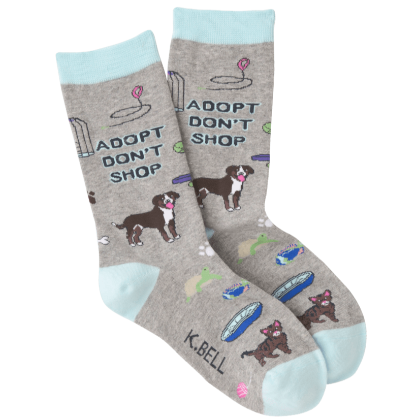 Raise awareness of adopting a dog or cat.  Adopt Don't Shop Women's Crew Socks promotes saving a pet from a shelter.  Say it loud and proud that you adopted your furry best friend! Animal rescue is one of the best things you can do!