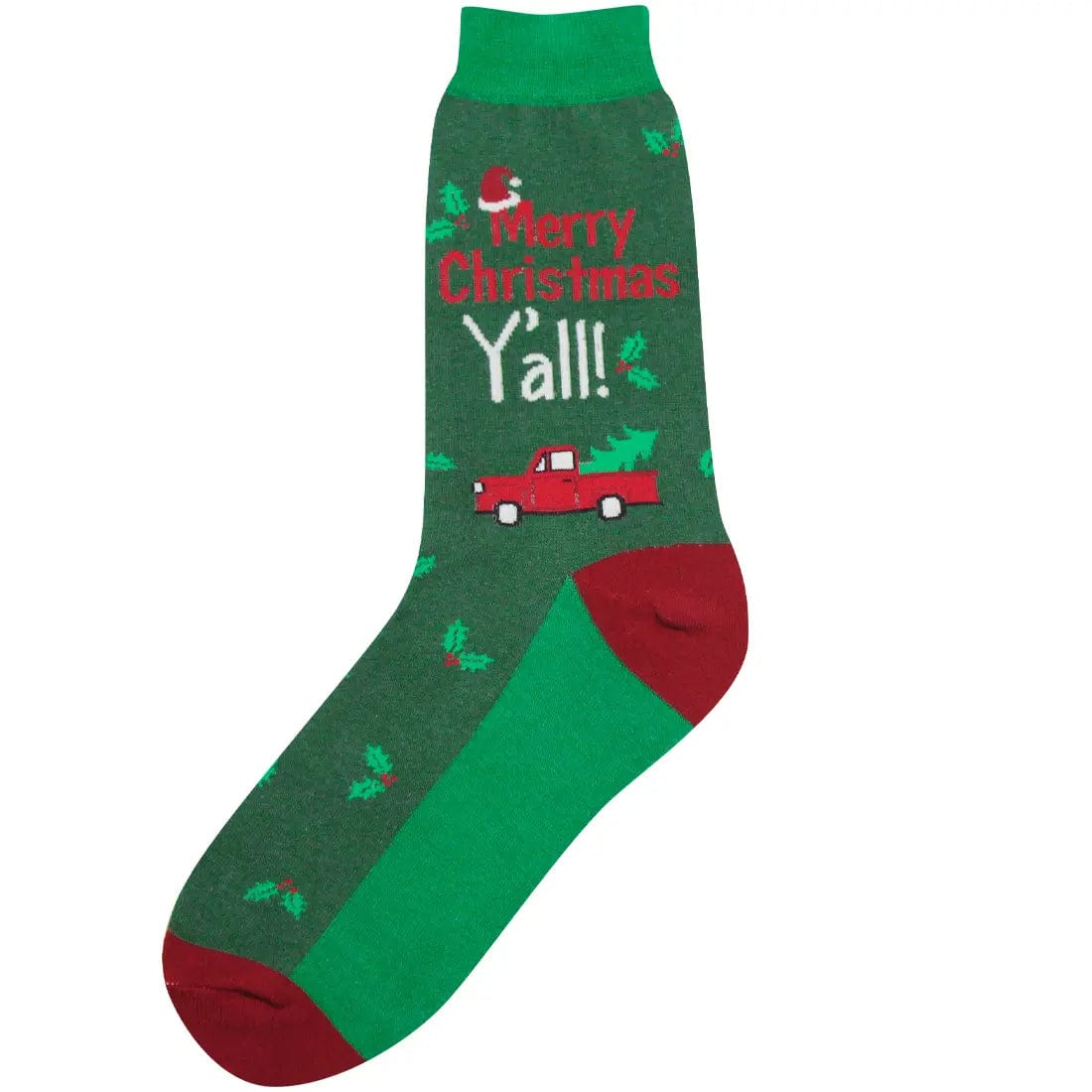 Merry Christmas Y'All! Is a friendly greeting whether you are from the south or anywhere a fun greeting is appreciated. A pattern of holly and a red pickup truck on a dark green background set the stage for holiday fun. Wearing a pair of these fun women's socks will melt your heart!