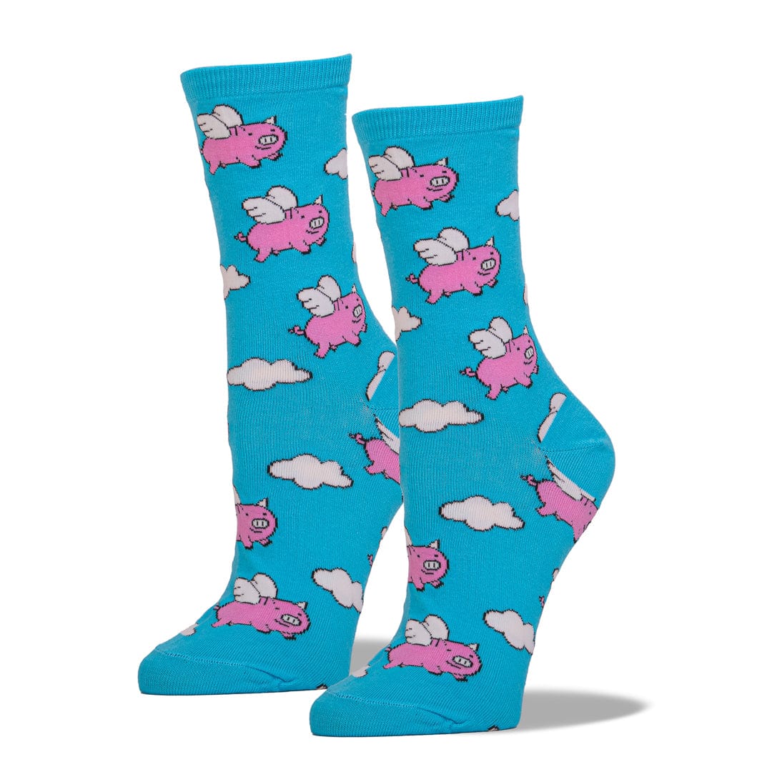 Flying Pigs Socks feature beautiful bright blue socks feature fluffy white clouds and, of course, winged pink pigs flying soaring amongst them.