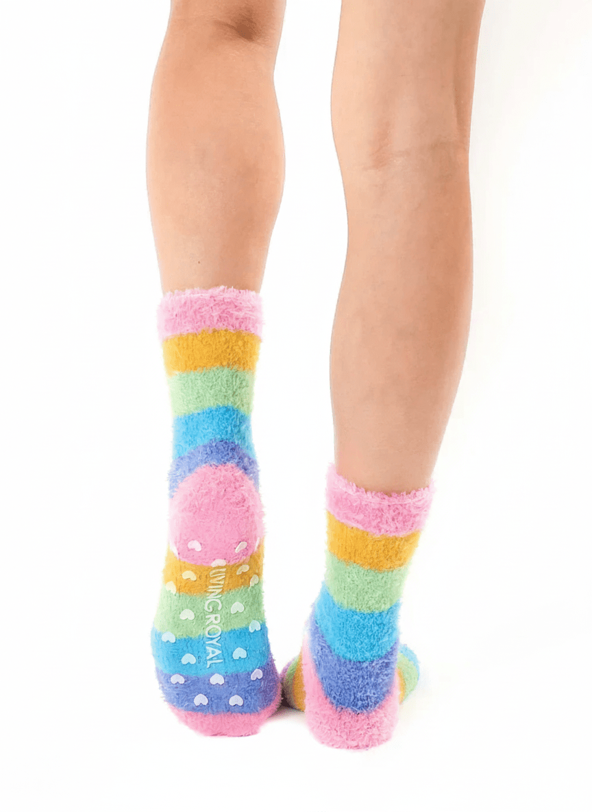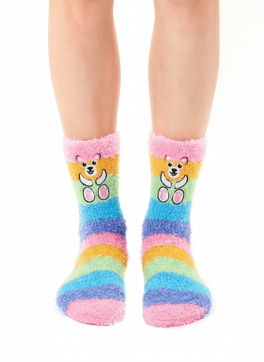 These fuzzy rainbow teddy crew socks will keep your feet warm and cozy all day long. With their playful design and soft texture, they'll add a touch of whimsy to any outfit. Plus, their rainbow colors will brighten up even the gloomiest of days. Perfect for any teddy bear lover!
