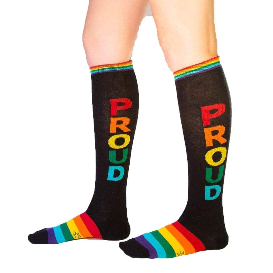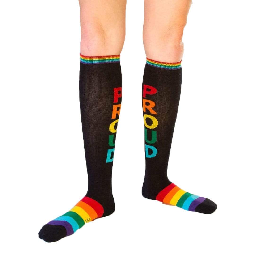 When you want to step out and be loud and proud, we have your Proud Knee High Socks. With its vibrant rainbow letters and trim, these socks will give our energy and support.