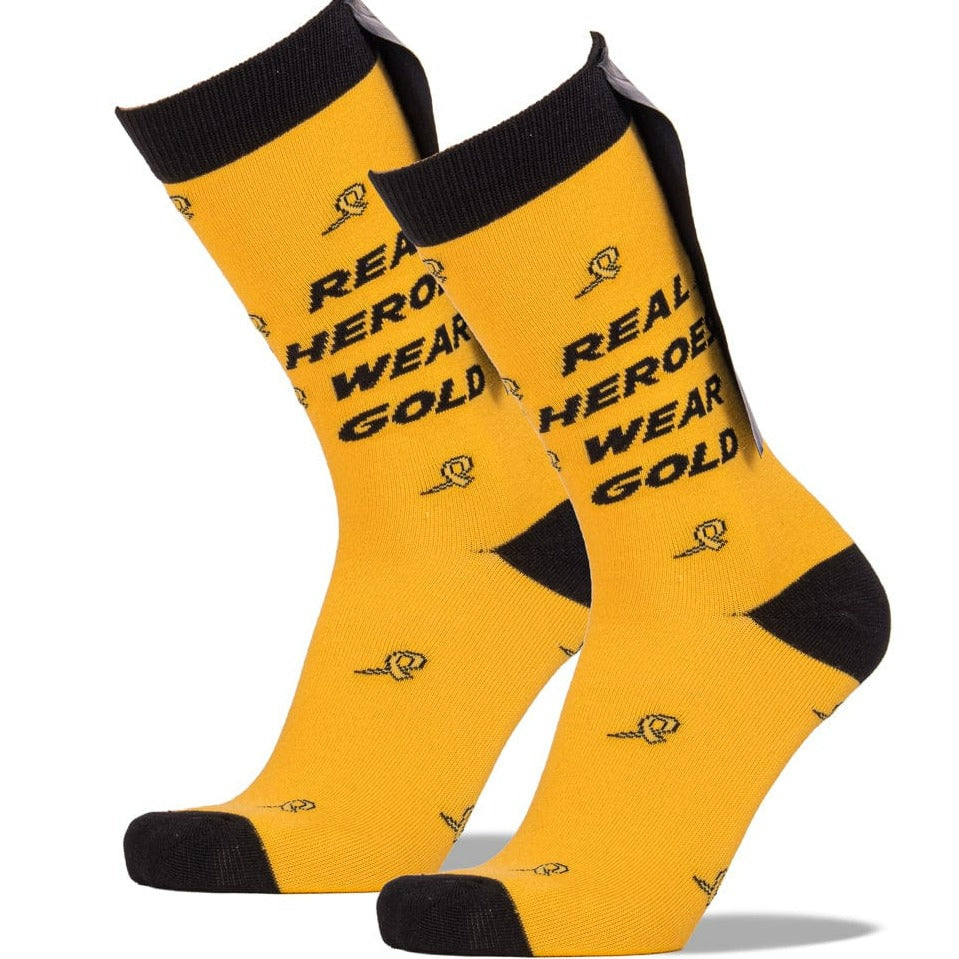 These American Cancer Society Super Hero Cape Unisex Crew Socks feature the words "Real Heroes Wear Gold" on a gold background with a distinctive black super hero cape! Made to support the American Cancer Society, these socks are a significant addition to the many socks created by John's Crazy Socks to raise awareness for medical conditions and causes.