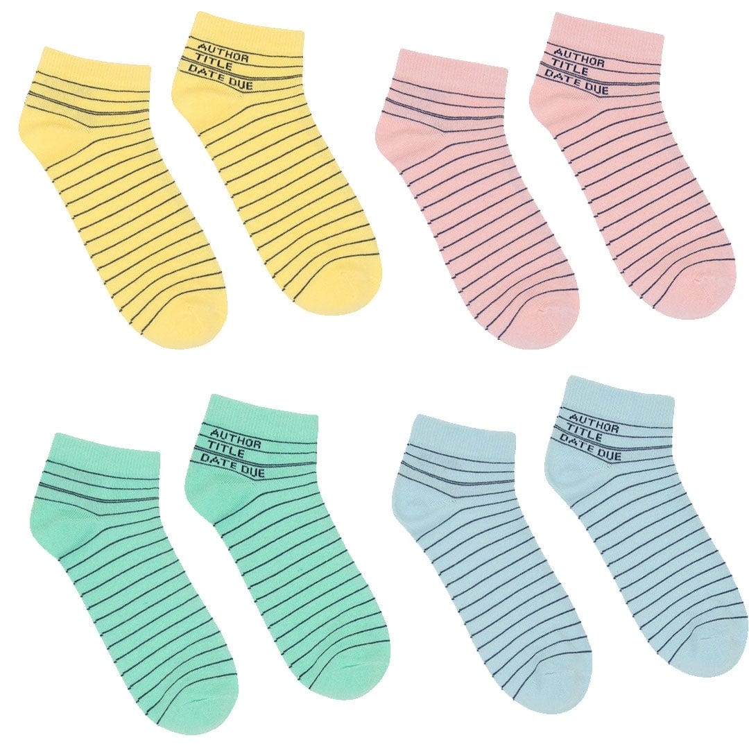 Time to "check out" these Library Card ankle socks. This great value 4-pack lets you get one in every color!