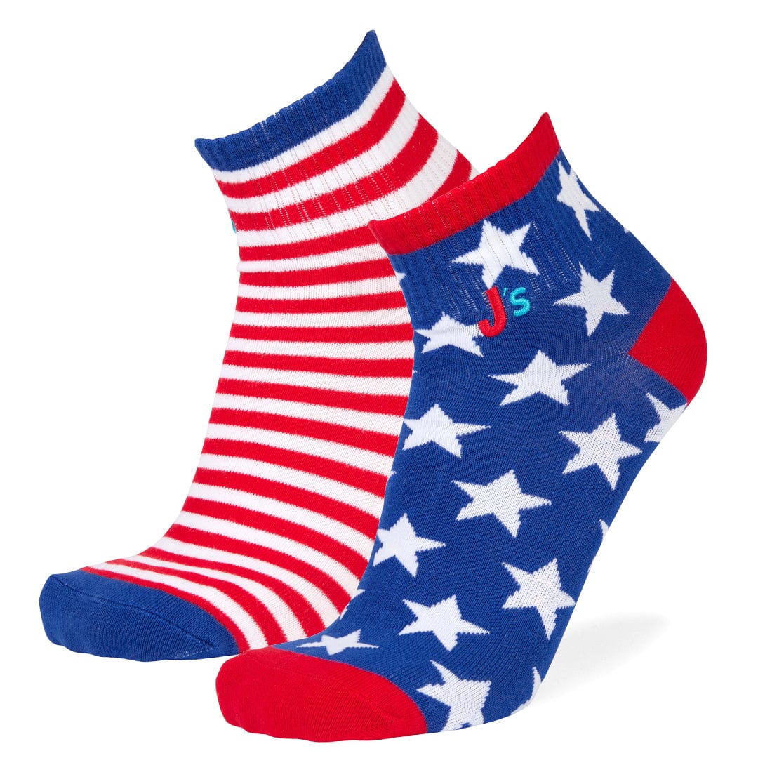 Get patriotic in a silly way with Mismatched Flag Ankle Socks! These fun patriotic socks feature mismatched flag designs, perfect for adding a playful touch to any outfit.