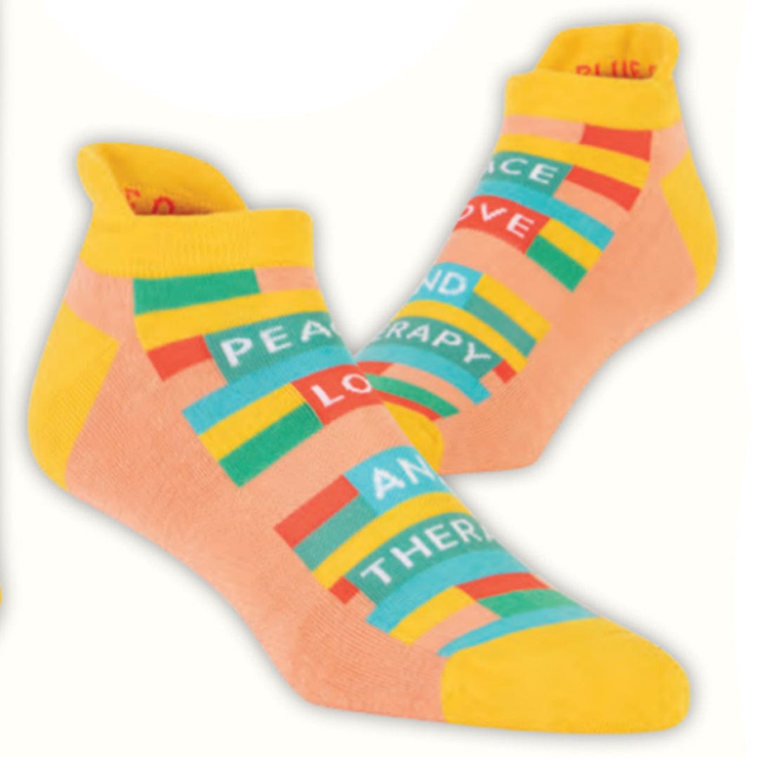 Inner peace! These socks can help bring you your inner peace! Socks feature the saying "peace love and therapy"