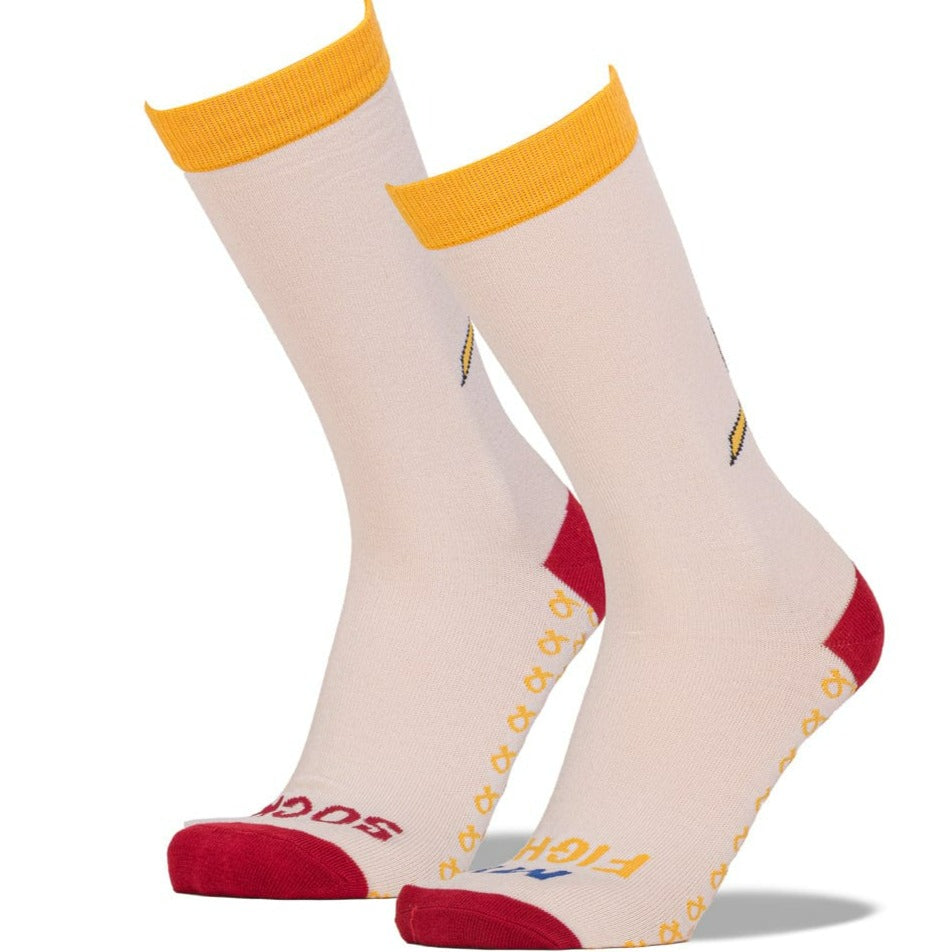These socks have "My Fight" on the left foot and "Socks" on the right foot, facing the wearer.