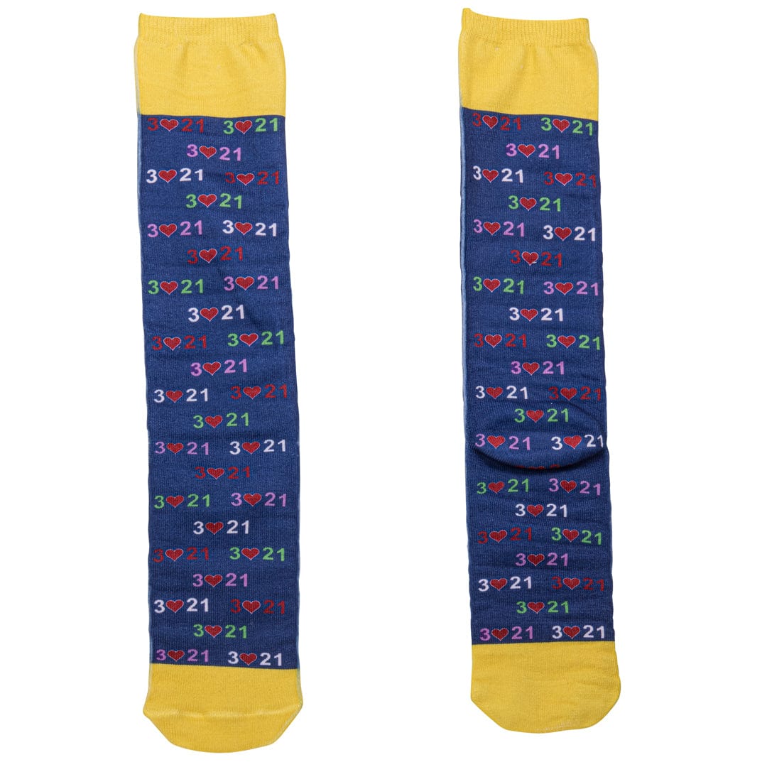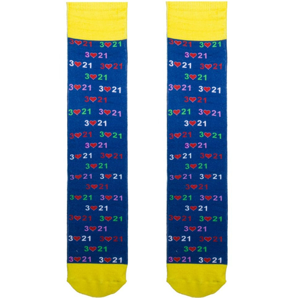 The sock has a multi-color icon of 3 ❤️ 21. The 3-21 represents both World Down Syndrome Day (March 21) and the extra chromosome that people with Down syndrome carry. Most of us are born with 23 pairs of chromosomes, but people with Down syndrome are born with a full or partial extra copy of chromosome 21, thus 3-21.