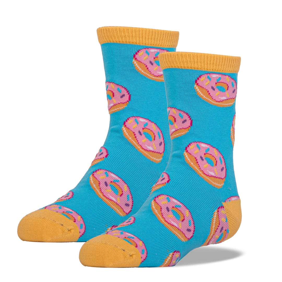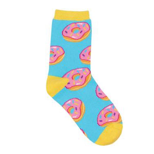 Share the love of all things sweet with these Donuts Socks. These adorable socks feature the classic sugary treat frosted with pink icing and sprinkles floating on a light blue background. The Donuts Socks feature a colorful yellow heel, toe, and trim.  These are a perfect fashion [and culinary] statement!