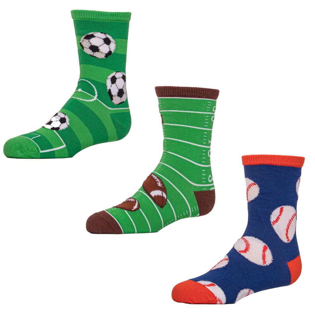 The Good Sport Crew Sock 3 Pack makes the perfect gift for any sports loving child. Simple, stylish, and great for the kid on the go. These socks make great socks for crazy sock day or crazy sports day at school.  Featuring the multi-color assortment featuring football, soccer and baseball socks.