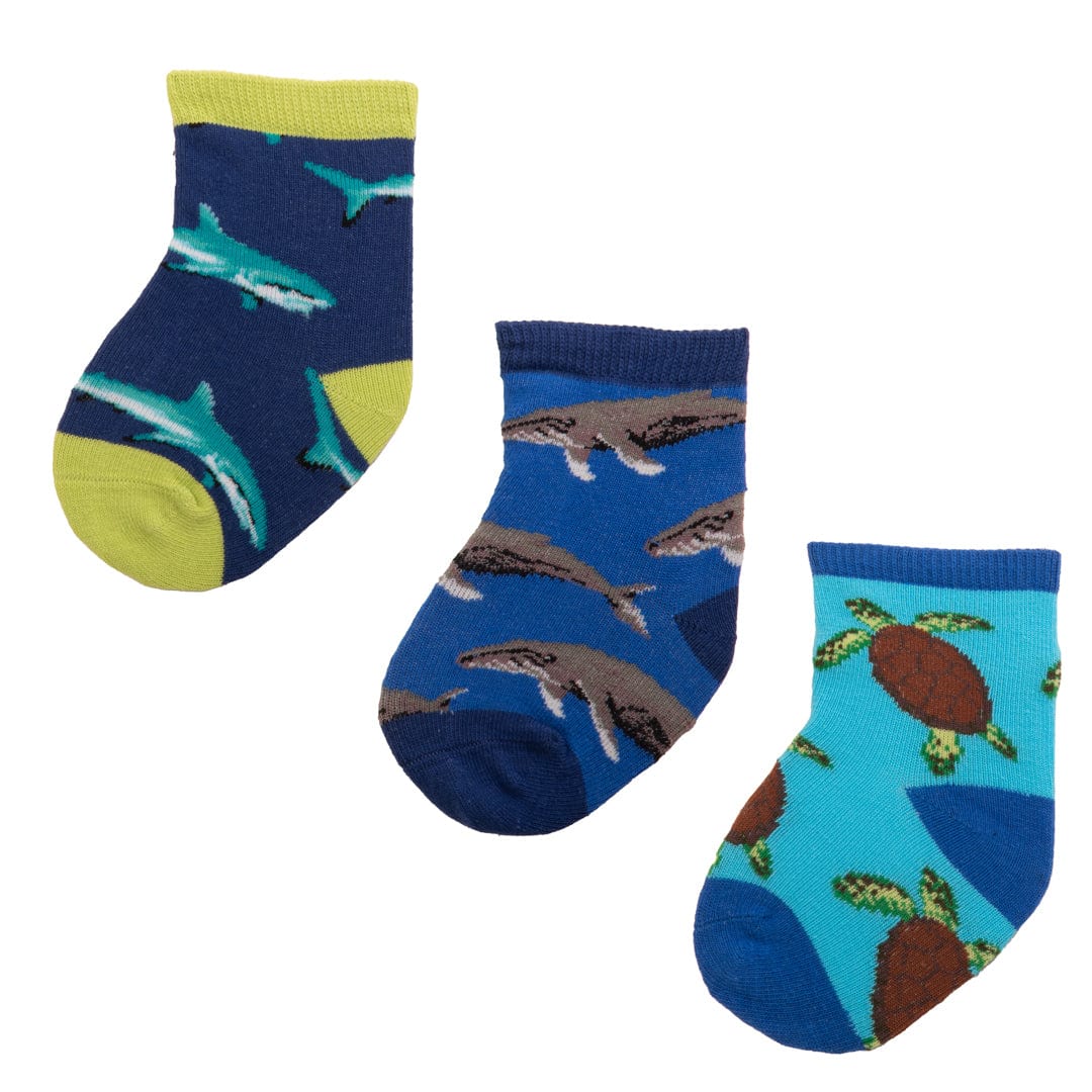 The Little Swimmers Crew Sock 3 Pack makes the perfect gift for any infant. Simple, yet stylish and great for the baby on the go.  Featuring sharks, turtles, and whales in shades of blue like the ocean. Great as a baby shower gift!