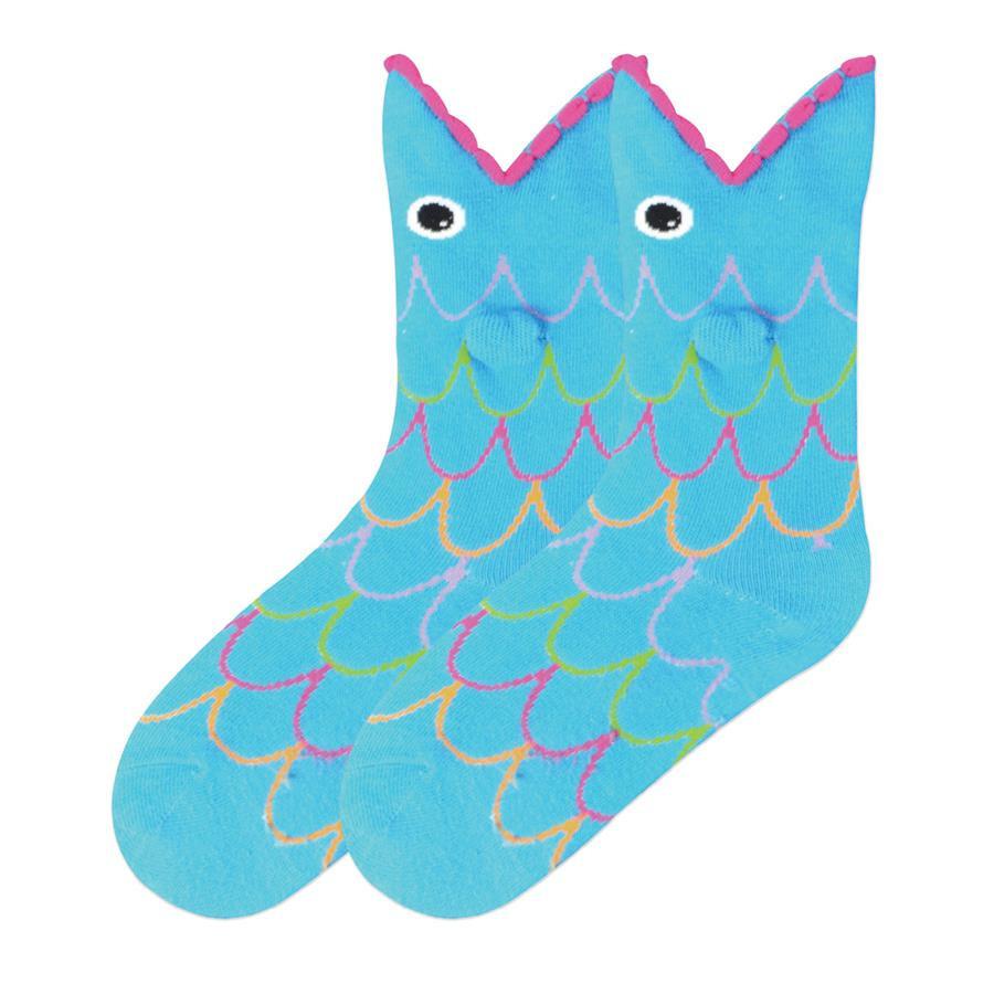 Have fun getting kids dressed with these Wide Mouth Fish Socks! These socks have an opening shaped like the mouth of a colorful turquoise fish. Featuring googly eyes and pink 'teeth' with rainbow colored scales, these cool animal socks add fun to any outfit!