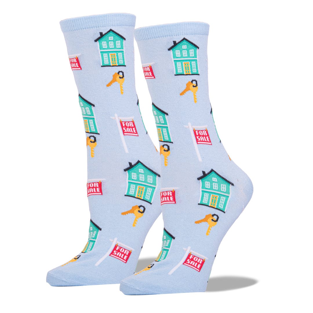 Home is where the heart is. Our Realtor Women's Crew Socks are light blue and covered in quaint houses with "For Sale" signs all over.  You may not be for sale, but these houses are!