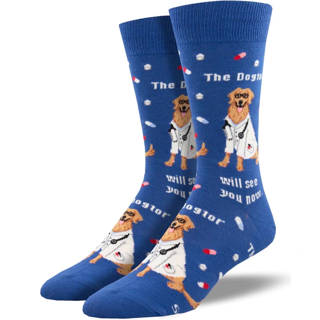 Can you imagine coming to see the doctor and you see that face?  I'd feel safer right away!  He may not be there, but our The Dogtor Is In Men's Crew Socks will happily put a smile on your face. This sweet Golden Retriever can take care of us anyday!