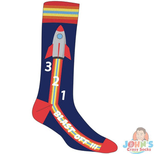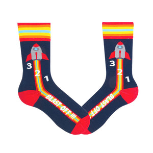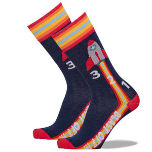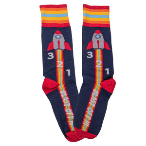 Rockets to space signify human technology and aspirations. Now, you can take your sock drawer to the stars with this awesome pair of navy blue 321 Blast Off Unisex Crew Socks. These socks depict a plume of smoke and rainbow fire beneath a rocket as it lifts off towards space.