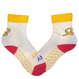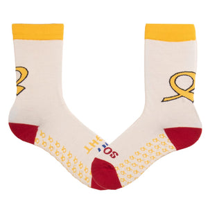 These American Cancer Society My Fight Children's Crew Socks feature the iconic gold ribbon, which is the international awareness symbol for Childhood Cancer. Emblazoned with the words "My Fight Socks", these impactful socks also have non-skid grips on the soles of the socks for additional stability. Made to support the American Cancer Society, these socks are a significant addition to the many socks created by John's Crazy Socks to raise awareness for medical conditions and causes.