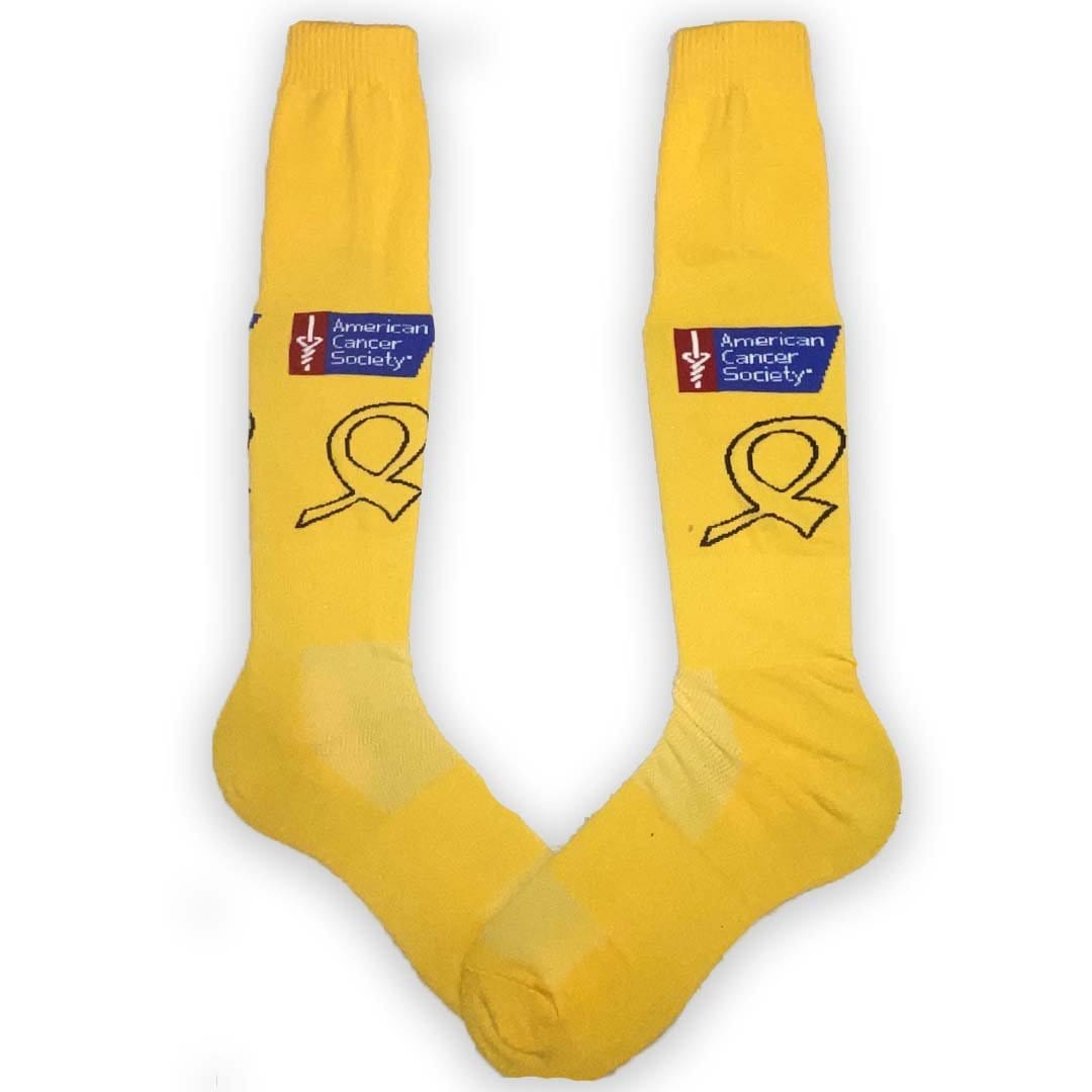 These athletic American Cancer Society Unisex Football Knee High Socks feature the silhouette of the iconic gold ribbon, which is the international awareness symbol for Childhood Cancer. Wear these socks on or off the football field to show your support for the Gold Together campaign! Made to support the American Cancer Society, these socks are a significant addition to the many socks created by John's Crazy Socks to raise awareness for medical conditions and causes.