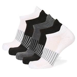 Black‑White‑Grey No‑Show 5‑Pack – monochrome palette of black, white & charcoal in blister‑blocking no‑shows.