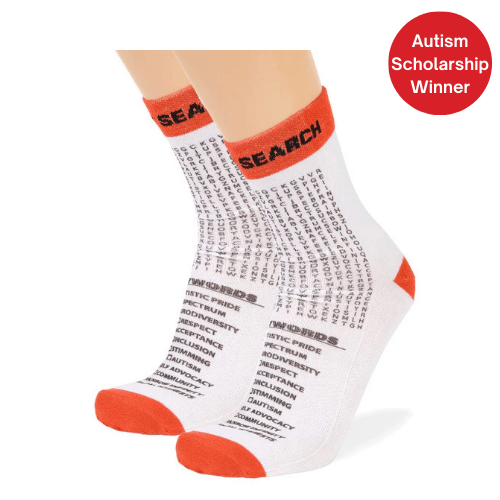 Isabella Blake is the winner of our 2021 Autism Can Do Scholarship with these amazing Word Search Crew Socks. Each pair of socks has a word search game with 12 words associated with autism: Autistic Pride, Spectrum, Neurodiversity, Respect, Acceptance, Inclusion, Stimming, Autism, Self Advocacy, Community, Rainbow Infinity, and Special Interests. Also, if you love to give back as we do, 10% from every purchase of the Word Search Crew Socks will go toward the Autism Can Do Scholarship.