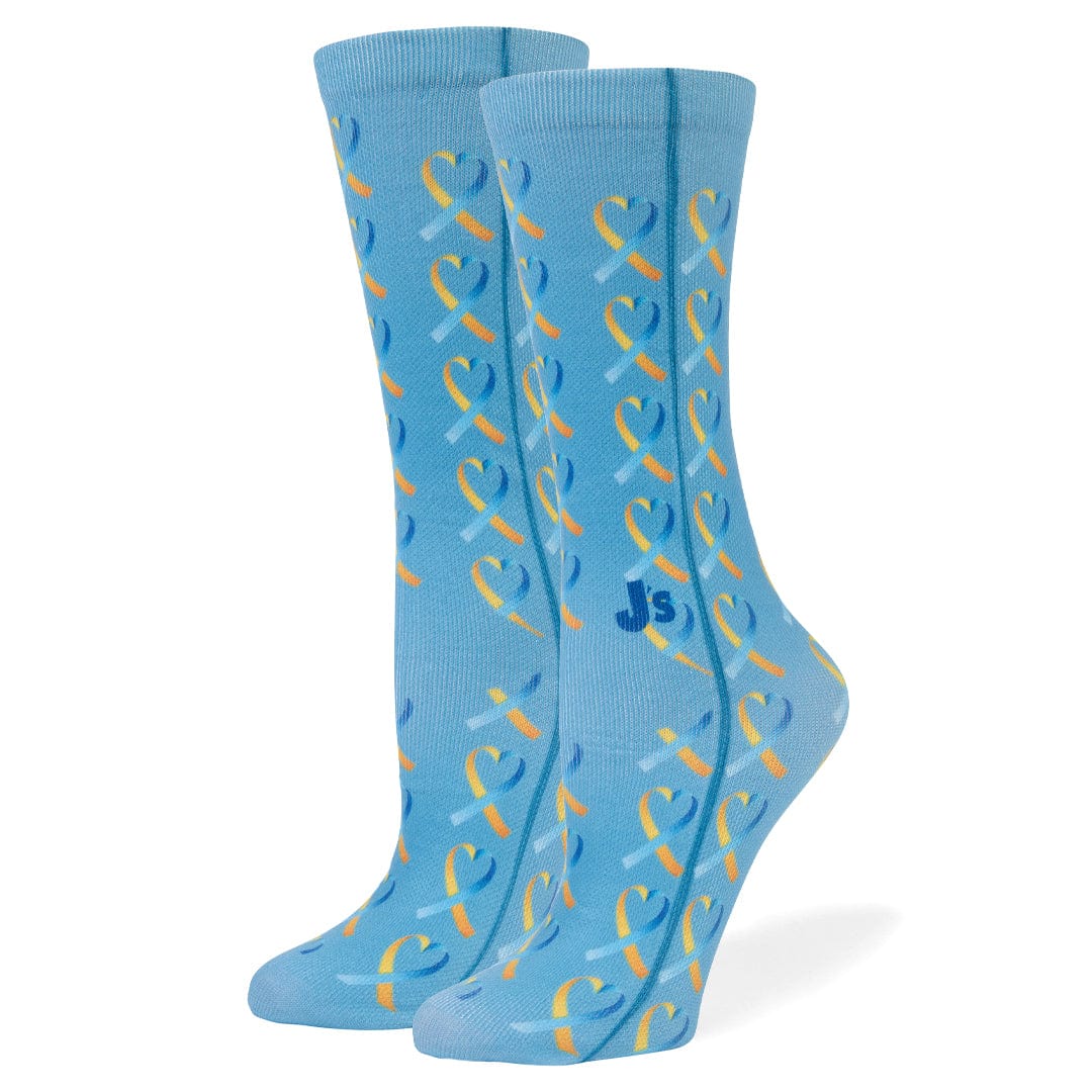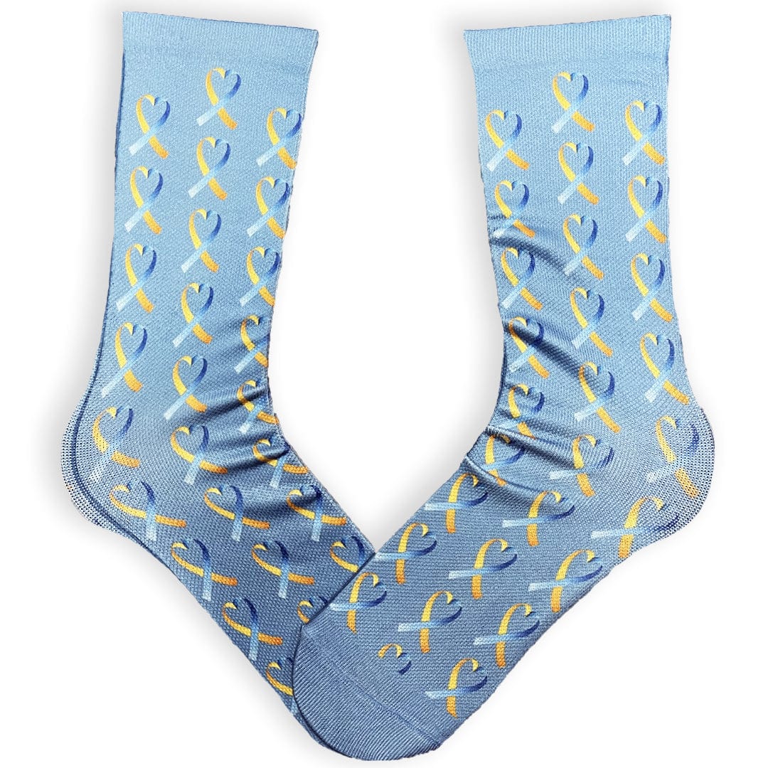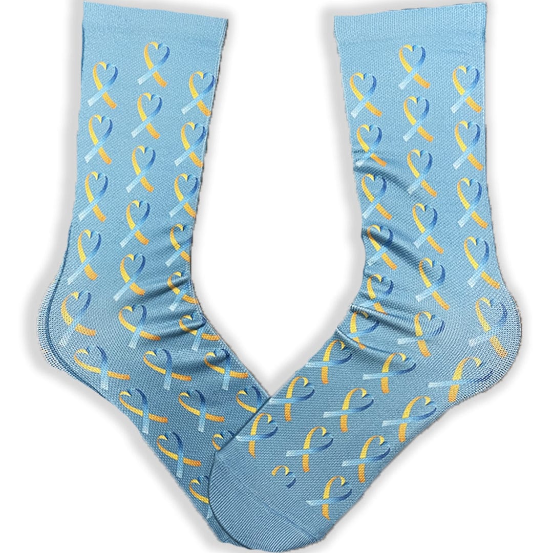 These light blue socks have a blue and yellow ribbon in the shape of a heart. We are thrilled to have these socks added to our assortment of exclusive Down syndrome awareness socks!
