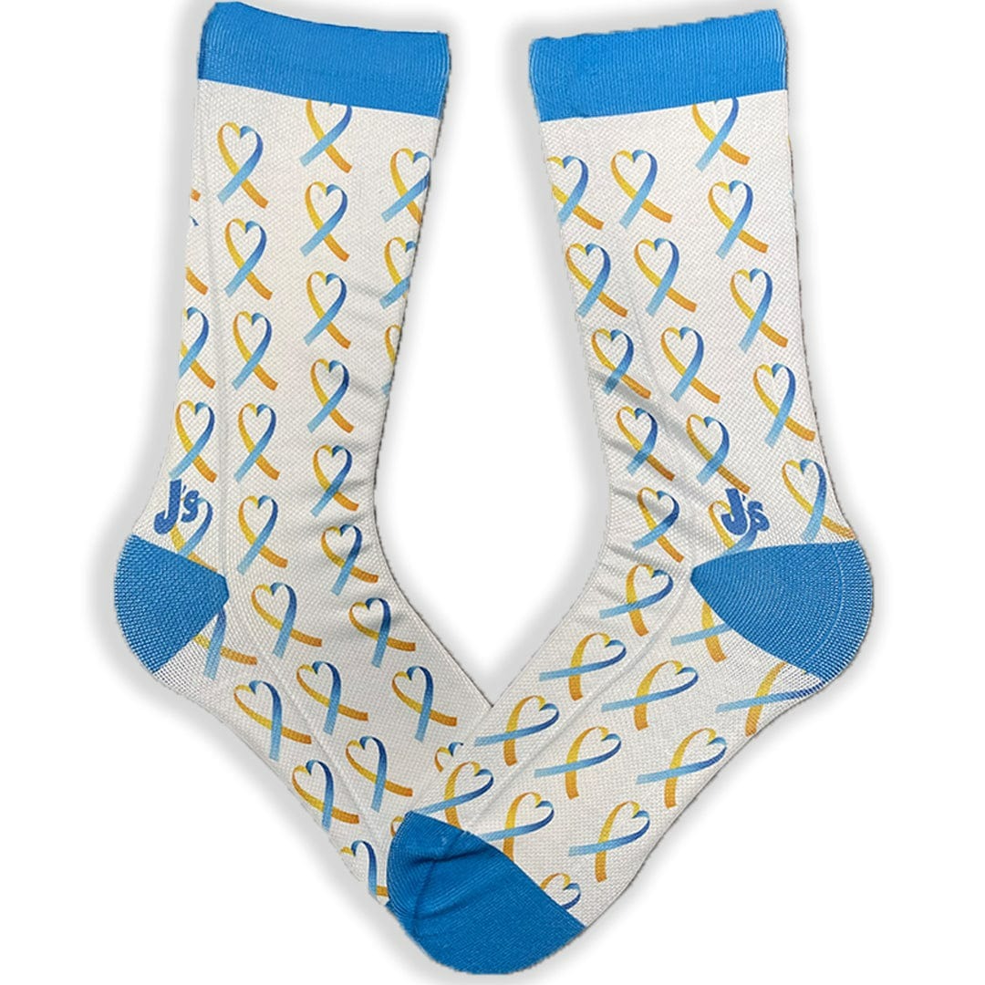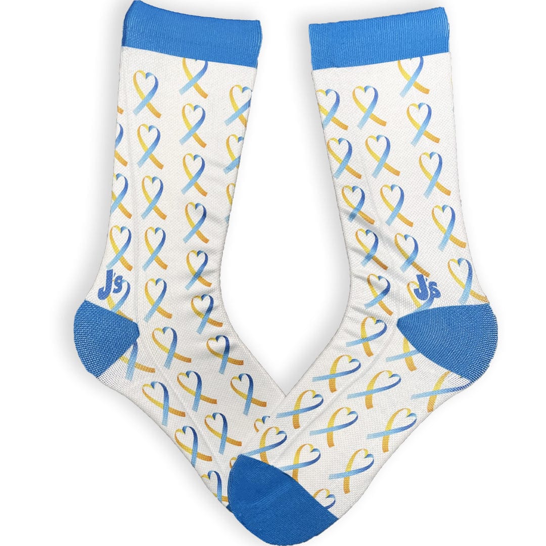 These white socks have a blue and yellow ribbon in the shape of a heart. We are thrilled to have these socks added to our assortment of exclusive Down syndrome awareness socks!