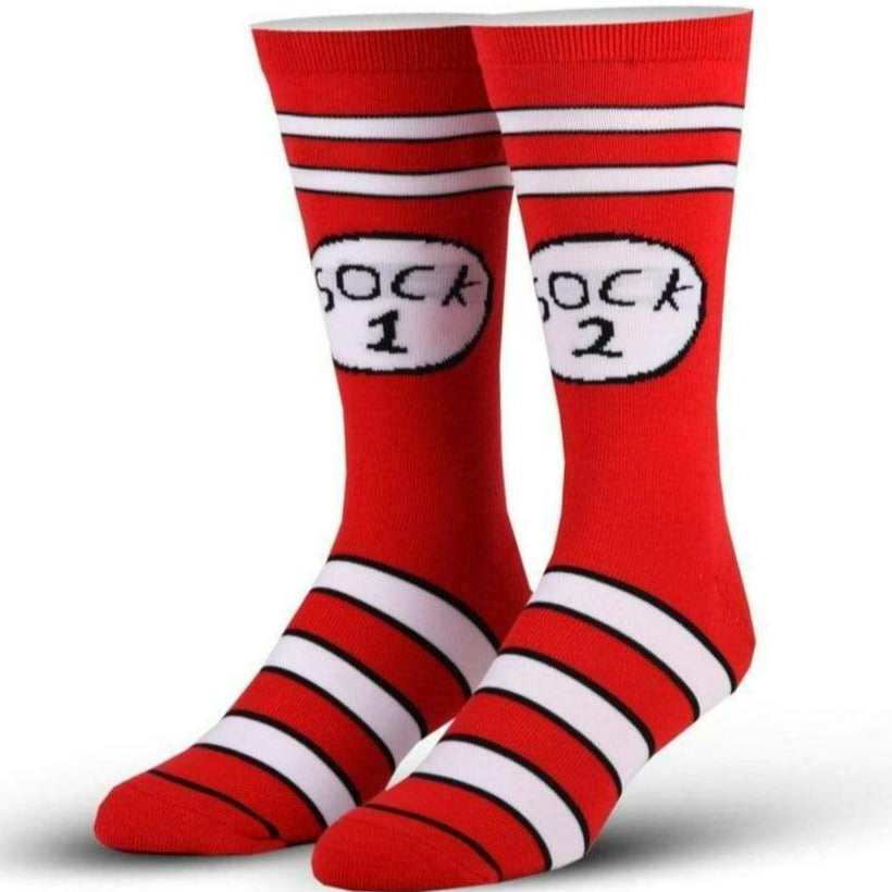 Dr. Seuss's favorite twins Thing 1 and Thing 2 showcased as our Sock 1 Sock 2 Crew Socks.  The coolest socks with the kookiest characters celebrating a classic children's book.