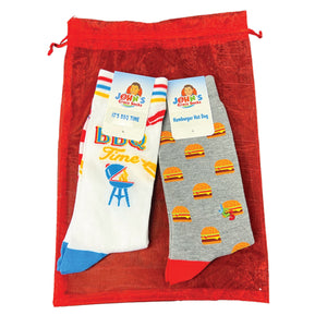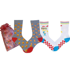 Grill up! You love to fire up the BBQ and get grilling. Who said being a meathead was a bad thing? This gift bag comes with 2 pairs of grilling-themed crew socks.
