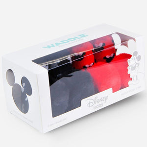 These Mickey & Minnie Pom Pom Baby Rattle Socks come in a 2 pack in a gift box. The black socks feature a Mickey Mouse silhouette and the red socks feature a Minnie Mouse silhouette both with a matching pom pom rattle attachment! The rattle attachments help aid in developing sensory skills for infants with sound and touch. This set makes the perfect new baby or shower gift.