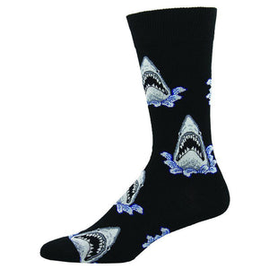 Channel the legendary jaws with these Shark Attack Socks! These terrifying creatures of the deep command the respect of all those who tread the oceans, even if their danger to humans is greatly exaggerated. In fact, you’re exponentially more likely to be injured driving through an intersection, walking under a coconut tree or being hit by a stray champagne cork than by a shark attack (stray champagne corks are responsible for 24 deaths a year, sharks average about 19! Shark Attack Socks are responsible for 0 so far!).