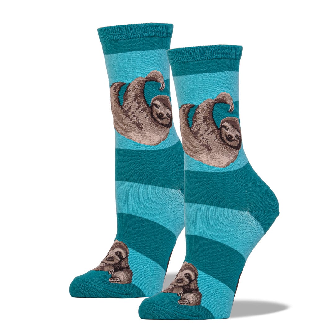 Sloth Stripe Socks take the beautiful – a bold blue striped sock – and add a playful sloth to make it both fun and sublime. Hiding amid the striped socks, you will find a furry, funny sloth. Some say the sloth is slow and lazy, but they are smart and conserve energy. For the sloth, that means no need to climb out of the tree if it can slow down and live on what it already has. For you, that may mean, why get out of bed when you could lounge for a bit a luxuriate in some extra sleep?