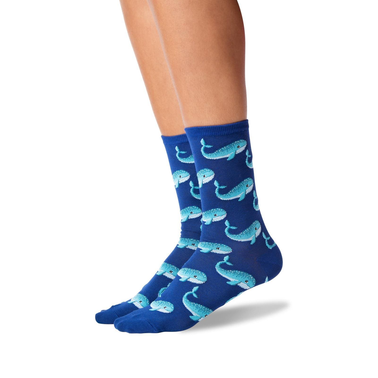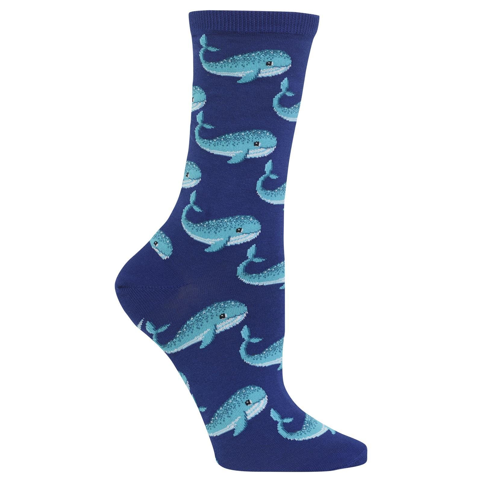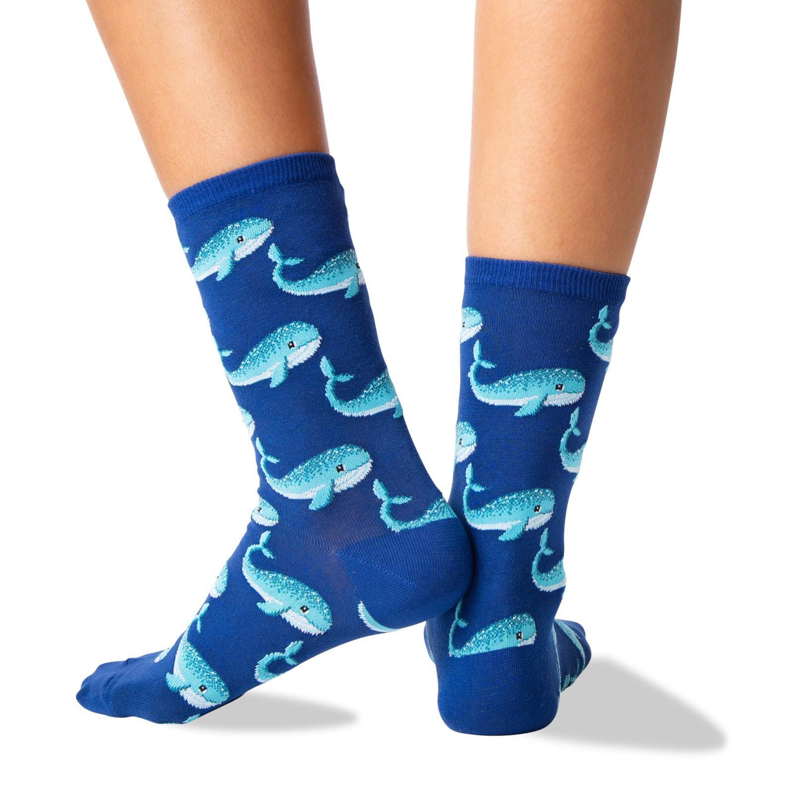 We love these Whale Women's Crew Socks with their navy blue whales floating on a Bermuda blue sea. They’re beautiful and fun.