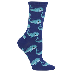 We love these Whale Women's Crew Socks with their navy blue whales floating on a Bermuda blue sea. They’re beautiful and fun.