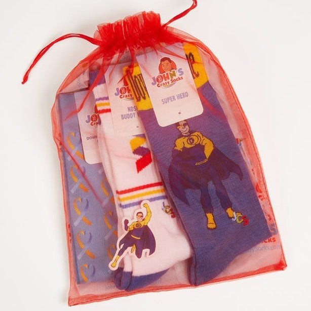This awesome gift bag includes three of our unique Down Syndrome Awareness theme socks and a fun Down Syndrome Superhero sticker - perfect to wear on March 21st!